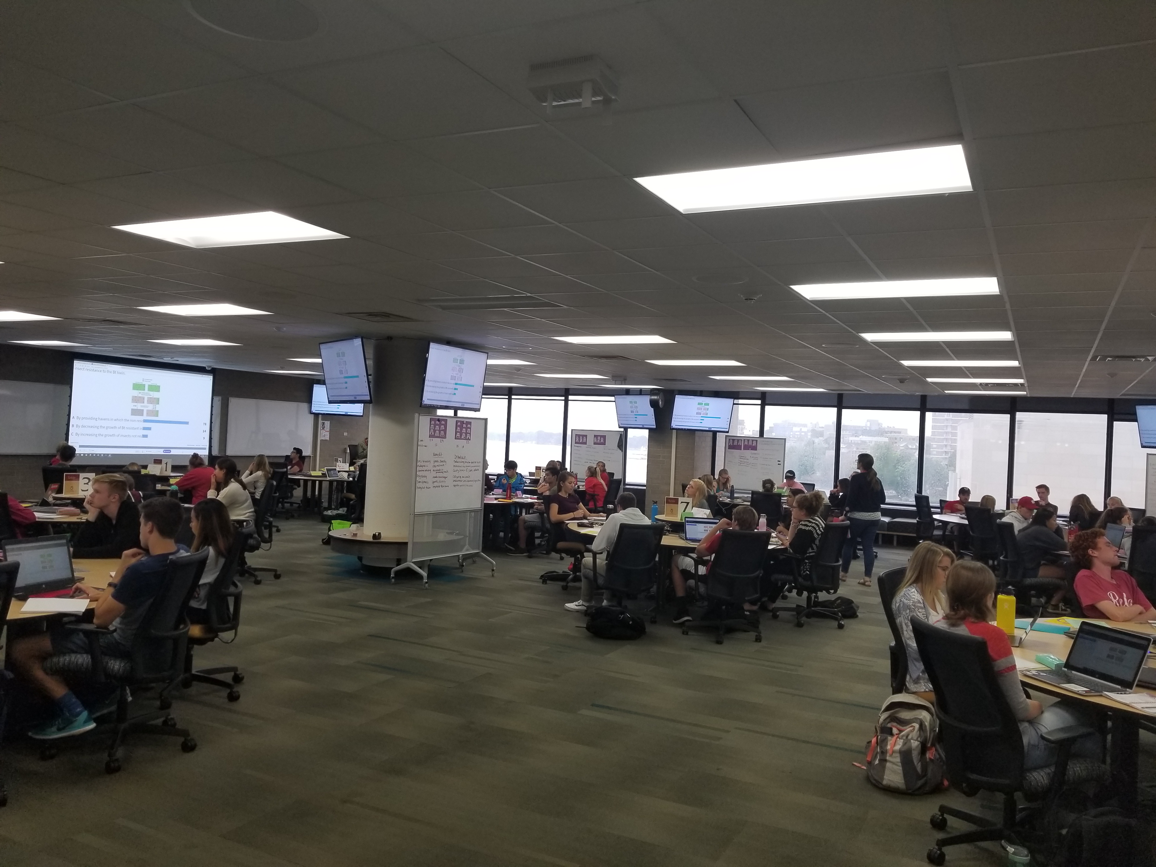 This course was co-developed and co-instructed as part of the WISCIENCE Teaching Fellows program. The course had over 100 students that formed groups of 5-6 at tables, and each table had computers, classroom monitors, and white boards. This type of classroom is considered a SCALE-UP (Student Centered Active Learning Environment with Upside-down Pedagogies) space. The purpose being to facilitate student interaction with each other, hands on activities, and problem solving. It is a truly unique experience that helps facilitate student engagement, and ultimately outcomes.